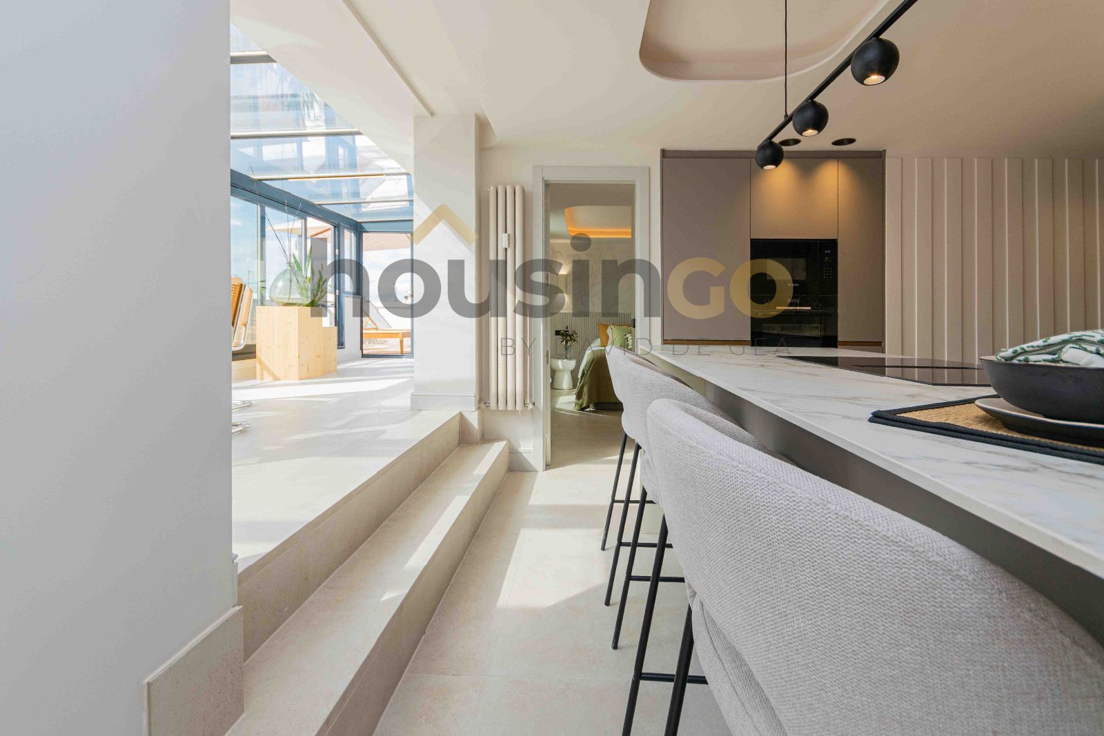 La vivienda, situada en la octava y última planta exterior, destaca por la luminosidad y sus impresionantes terrazas. Dispone de un amplio salón con cocina abierta de diseño, orientación sur y grandes ventanales que conectan directamente con las terrazas, ofreciendo vistas despejadas sobre Madrid. La cocina, moderna y totalmente equipada, está pensada para disfrutar tanto del día a día como de momentos especiales. La zona de descanso cuenta con tres dormitorios amplios, todos con armarios empotrados, y tres baños completos, dos de ellos en suite, diseñados con materiales de primera calidad.