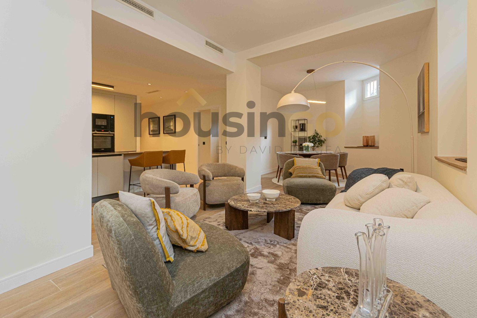 El interior ha sido diseñado para maximizar el espacio y la funcionalidad. Cuenta con un amplio salón-comedor integrado, ideal para el día a día y para reuniones, y una cocina moderna con gran península central, equipada con electrodomésticos panelados, que aportan continuidad visual y un estilo contemporáneo.
