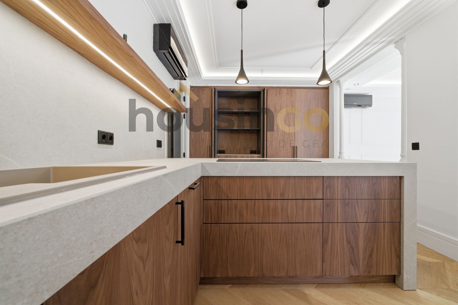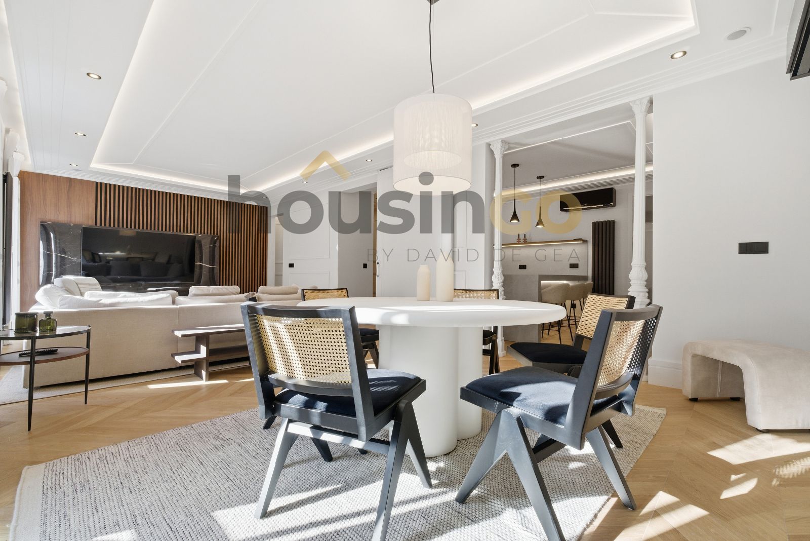 Sus 150 m2, se distribuyen en un amplio salón comedor contando con luces de alta gama Santa e Cole, el salón da acceso a sus tres balcones al exterior de la calle, lo que brinda ventilación y luz natural, además cuenta con una chimenea de alcohol en salón. Su cocina abierta y diáfana, que goza de una isla integrada perfecta para cocinar y socializar con todas tus visitas. Con electrodomésticos Bosch alta gama, vinoteca, cocina en madera natural,