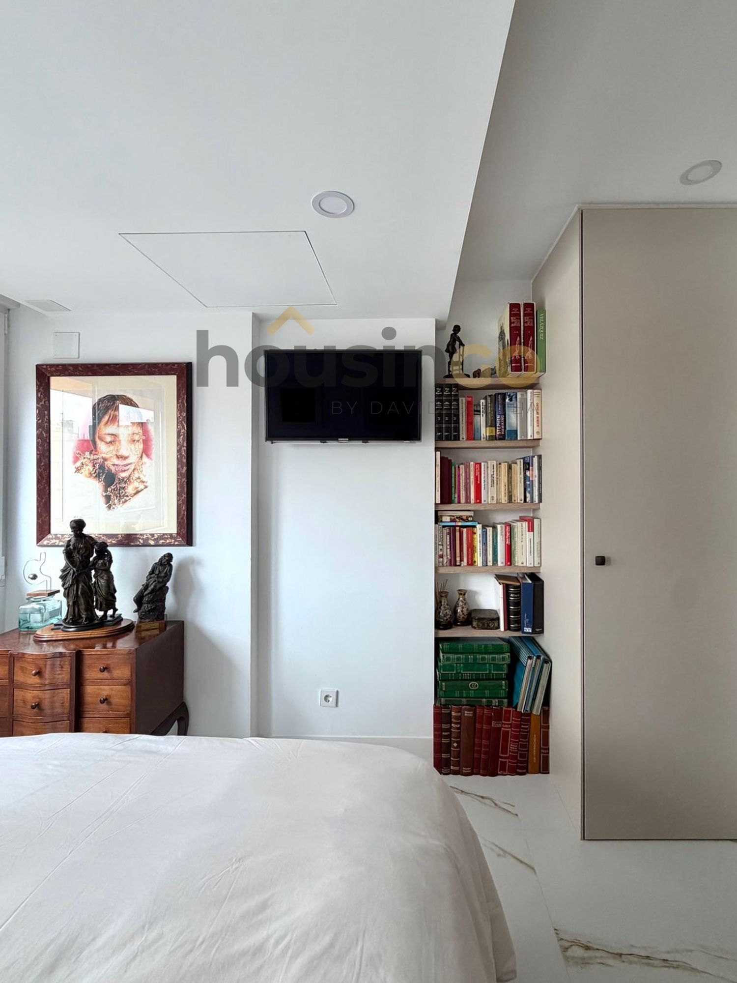 El dormitorio se integra mediante puertas correderas, permitiendo adaptar el espacio con flexibilidad sin perder continuidad visual. Dispone de armarios empotrados de suelo a techo que optimizan el almacenamiento.